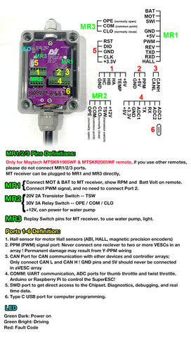 9:Communicate with Maytech waterproof remote controller. More parameters can be displayed on remote controller, such as main power voltage, motor rpm, current/amps, motor rpm,motor temperature, speed controller/ESC temperature. Users do not need to solder motor cable to receiver to display the main power and motor rpm, which greatly protect the receiver.
